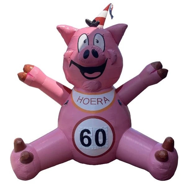 Een leuke opvallende feestpop. Dit 3,50 meter roze varken valt goed op! Het is een vrolijke verschijning. Er staat duidelijk 60 jaar op de borst!