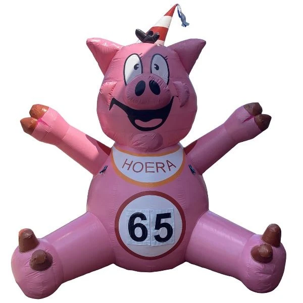 Een leuke opvallende feestpop. Dit 3,50 meter roze varken valt goed op! Het is een vrolijke verschijning. Er staat duidelijk 65 jaar op de borst!