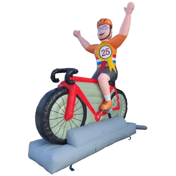 Een leuke feestpop met als thema wielrennen. Deze 4 meter hoge fietser pop valt goed! Er staat duidelijk 25 jaar op zijn borst!