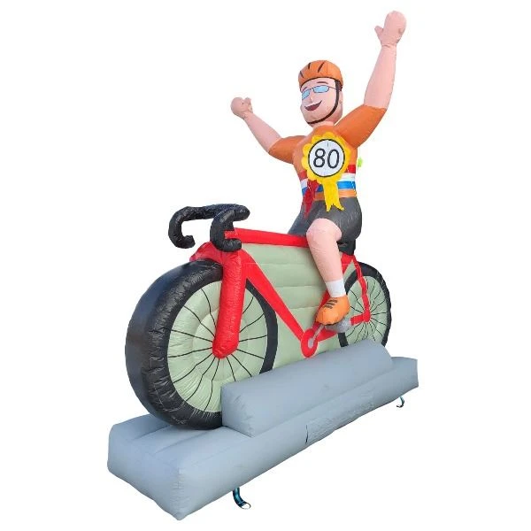 Een leuke feestpop met als thema wielrennen. Deze 4 meter hoge fietser pop valt goed! Er staat duidelijk 80 jaar op zijn borst!