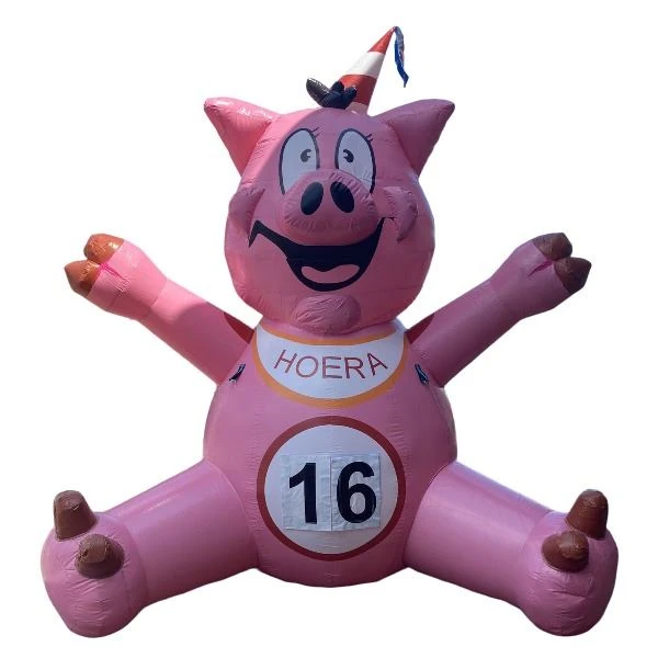 Een leuke opvallende feestpop. Dit 3,50 meter roze varken valt goed op! Het is een vrolijke verschijning. Er staat duidelijk 16 jaar op de borst!