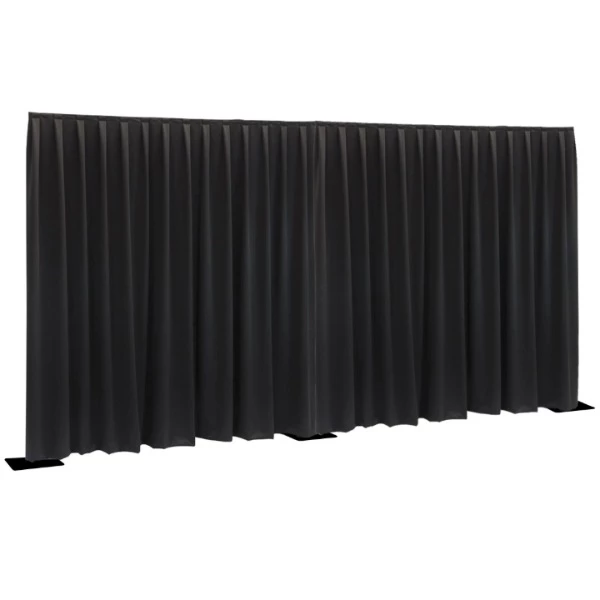 Ons Pipe & drape systeem kan uw ruimte vanaf 1,80 meter tot en met 3 meter hoog afschermen. Een enkele ligger heeft ingeschoven een lengte van 1,80 meter, maar volledig uitgeschoven maximaal 3 meter. Het zwarte doek wordt door middel van klittenband aan de ligger bevestigd. Dit systeem staat stabiel door de grondplaten die per stuk 8 kg wegen.