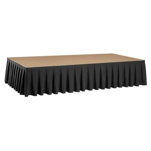 Een podium rok maak het echt af. Daarnaast kunt u op deze manier de ruimte onder het podium gebruiken om spullen neer te zetten. Op deze manier zijn die spullen mooi uit het zicht. Op de podiumdelen zitten stukjes klittenband evenals op de rokken. Op deze manier kunt u de rokken eenvoudig aan het podium bevestigen.