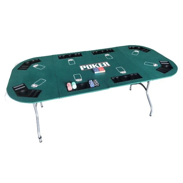 De tafel is gemakkelijk inklapbaar met een afmeting van L x B: 180 x 90 cm. De pokertafel bevat ook 8 bekerhouders zodat er geen drinken wordt gemorst op de spelkaarten. De tafel wordt geleverd inclusief fiches en speelkaarten.
